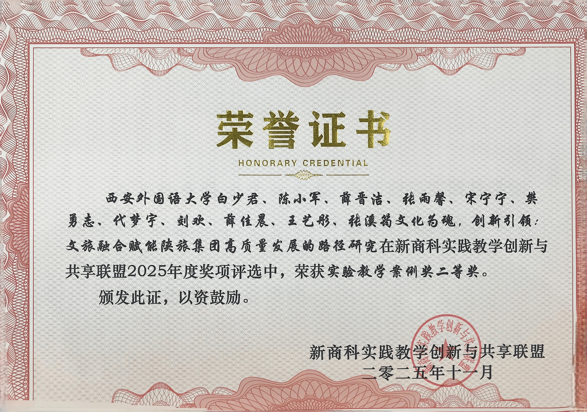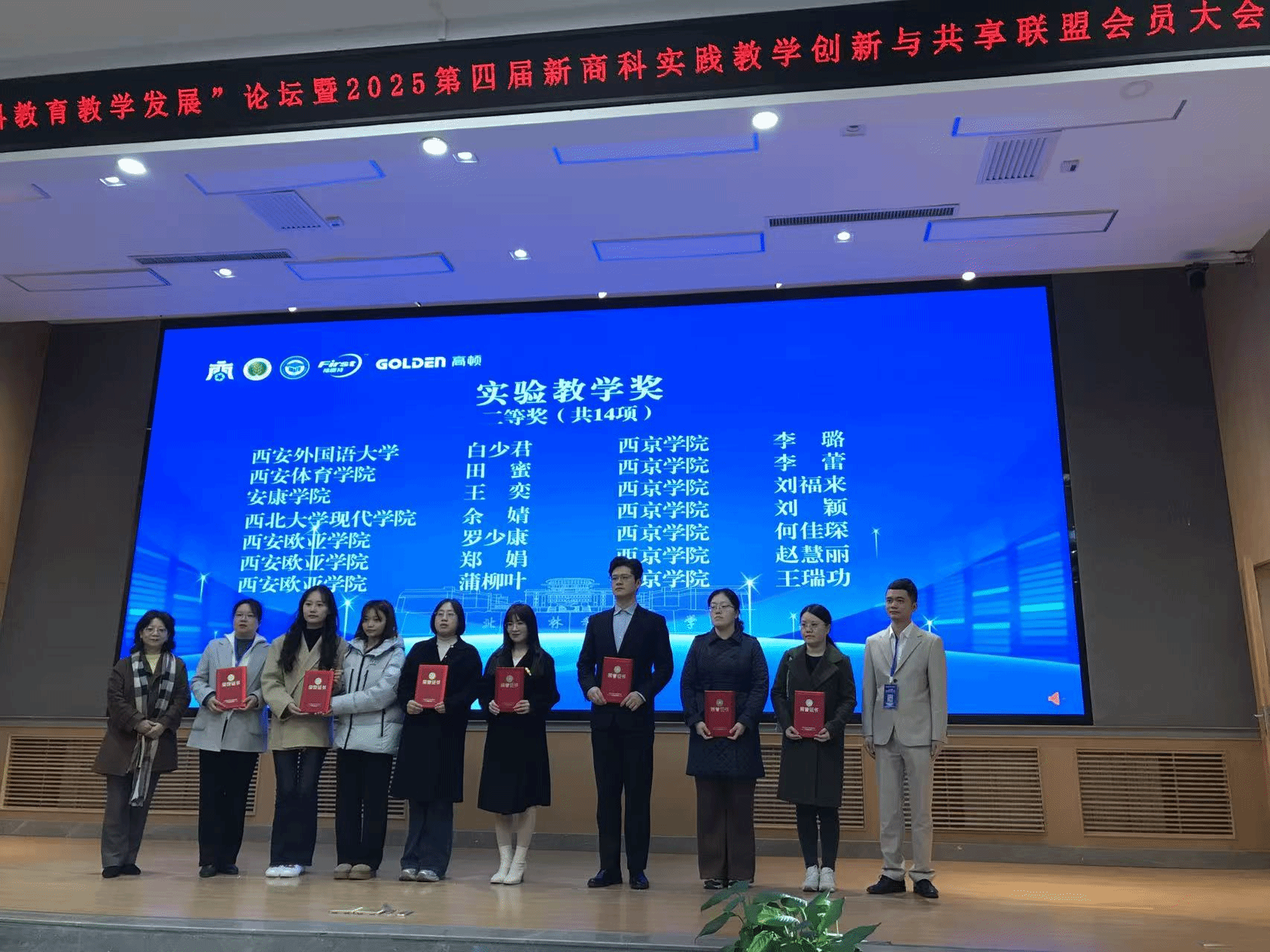 2025年11月29日,第四届新商科实践教学创新与共享联盟会员大会在西北农林科技大学隆重召开。西安外国语大学商学院白少君、陈小军、薛晋洁、张雨馨、宋宁宁、樊勇志、代梦宇、刘欢、薛佳晨、王艺彤、张溪筠组成的师生团队,凭借《文化为魂,创新引领:文旅融合赋能陕旅集团高质量发展的路径研究》案例,在大会 2025 年度奖项评选中荣获实验教学案例奖二等奖。白少君教授带领学生代表参会并登台领奖,充分展现了我院师生在新商科实践领域的扎实功底与创新实力。
