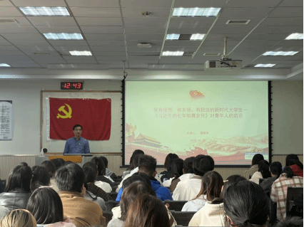 郑锐华以习近平总书记青年时期在梁家河的七年奋斗岁月为切入点,生动阐释“敢于追求、不怕吃苦、勤于学习、爱办实事、善于思考、勇于担当”六大品质。他结合习近平总书记克服“跳蚤关、饮食关、劳动关、思想关”的成长经历,强调青年学子要坚定理想信念,将个人理想融入国家发展大局。郑老师还分享了西安外国语大学优秀校友的先进事迹:程一堃的外交担当、郑丽的维和奉献、董宇辉的创新实践等,生动展现新时代青年将个人理想与国家使命相结合的榜样力量。