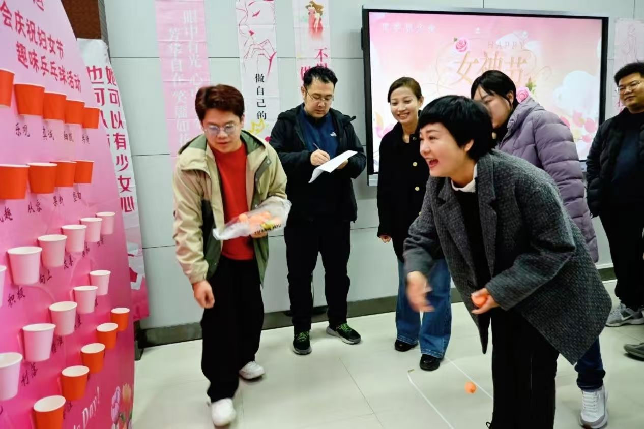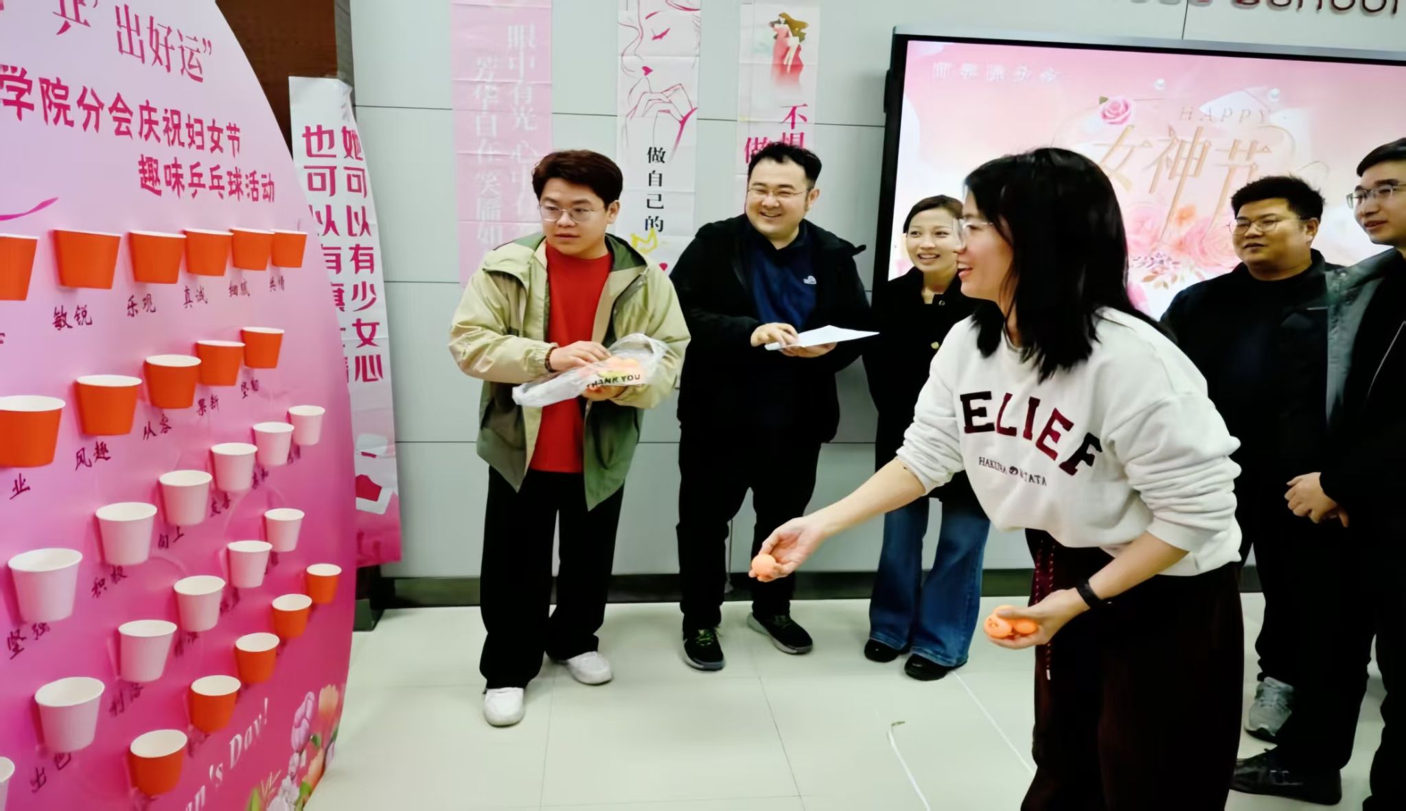 为庆祝“三八”国际妇女节,丰富学院教职工的文化生活,学院工会于教学楼G区210会议室举办了“巾帼逐乐·‘乒’出好运”趣味乒乓球投杯活动。为营造尊重女性、关爱女职工的良好氛围,活动特别邀请男职工作为支持者参与其中。