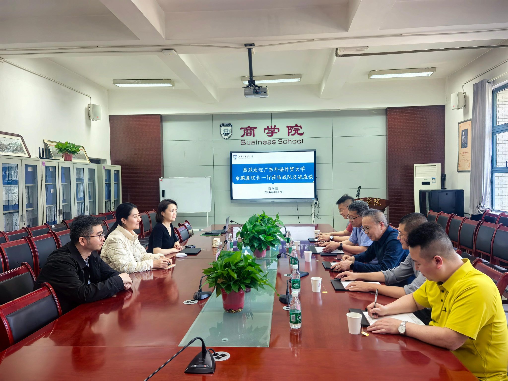 2026年4月17日下午,广东外语外贸大学会计学院余鹏翼院长一行莅临我院交流座谈。学院院长耿紫珍、副院长孙婧雯及会计系副主任付强出席会议,与来访嘉宾深入交流。