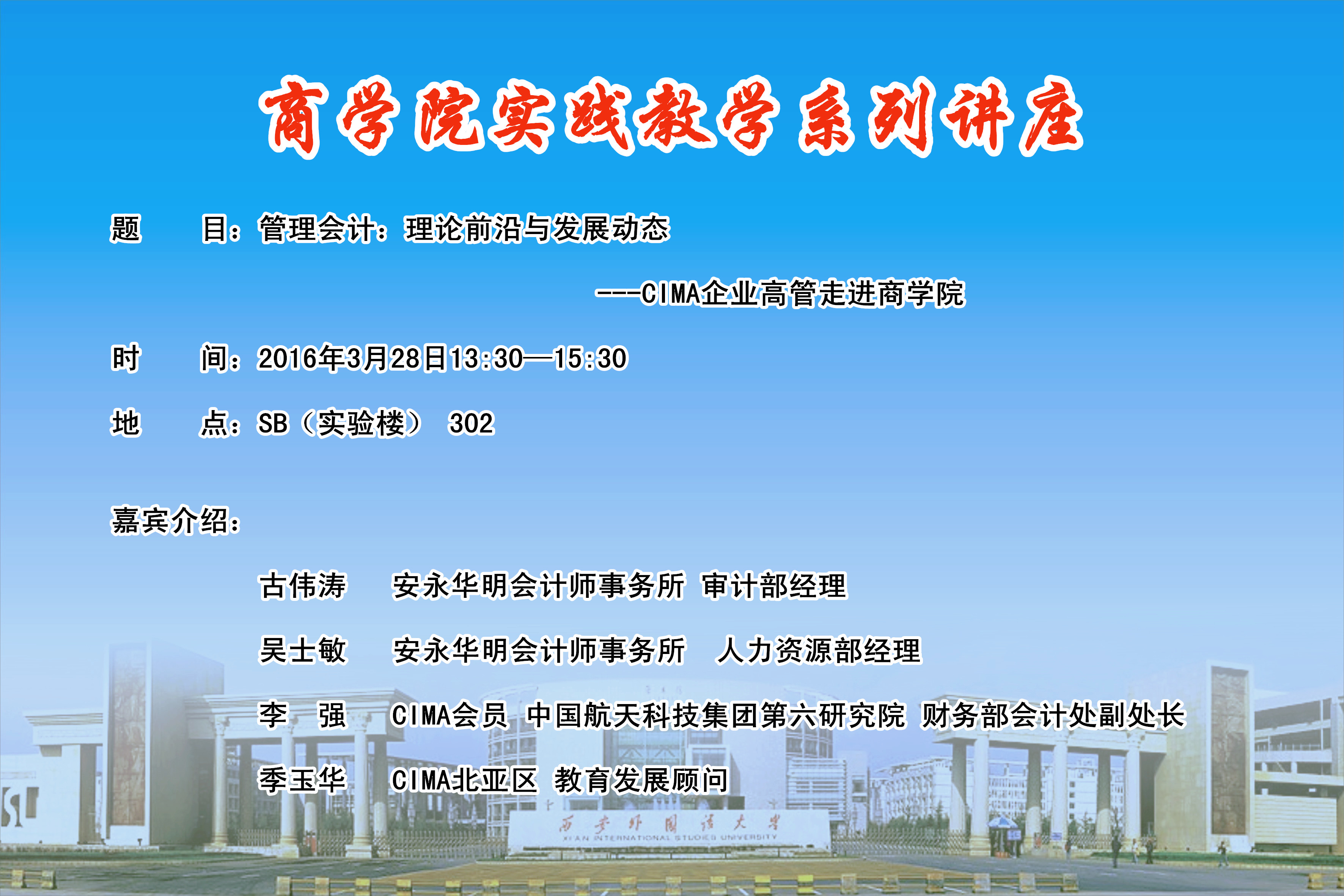 2016年3月28日下午,为提升CIMA教改班学生专业知识,了解更多企业实践经验,提高专业素养,我院特邀安永华明会计师事务所(西安分所)审计部经理古伟涛先生、程凯先生、王锋革先生,人力资源部经理吴士敏女士,CIMA会员、中国航天科技集团第六研究院财务部会计处副处长李强先生,CIMA华东区域总监冯勇先生,CIMA北亚区教育发展顾问季玉华女士在SB302进行了关于“管理会计:理论前沿与发展动态“实践教学系列讲座。我院院长杨霞博士,副院长刘军伟博士,“教育部新世纪优秀人才”杨鹏鹏教授,CIMA教学团队全体任课教师及学生共计100多位学生全程参加了本次讲座。
