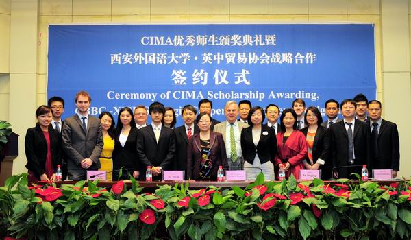 在热烈的掌声中,户思社校长与英国英中贸易协会总裁Stephen Philips先生代表双方签署了战略合作协议,并为西安外国语大学首届CIMA优秀学生及优秀教师颁奖。我院2009级商务英语专业CIMA方向教改班的刘会杰同学获得了CIMA英国皇家特许管理会计师公会授予的“CIMA学习标兵奖”,任泽静同学获得了“CIMA单科优秀奖”,2009级商务英语CIMA教改班获得了“优秀班级集体奖”,王敏、毕可佳、孙婧文等三位任课教师获得了“CIMA中国优秀教师奖”。
