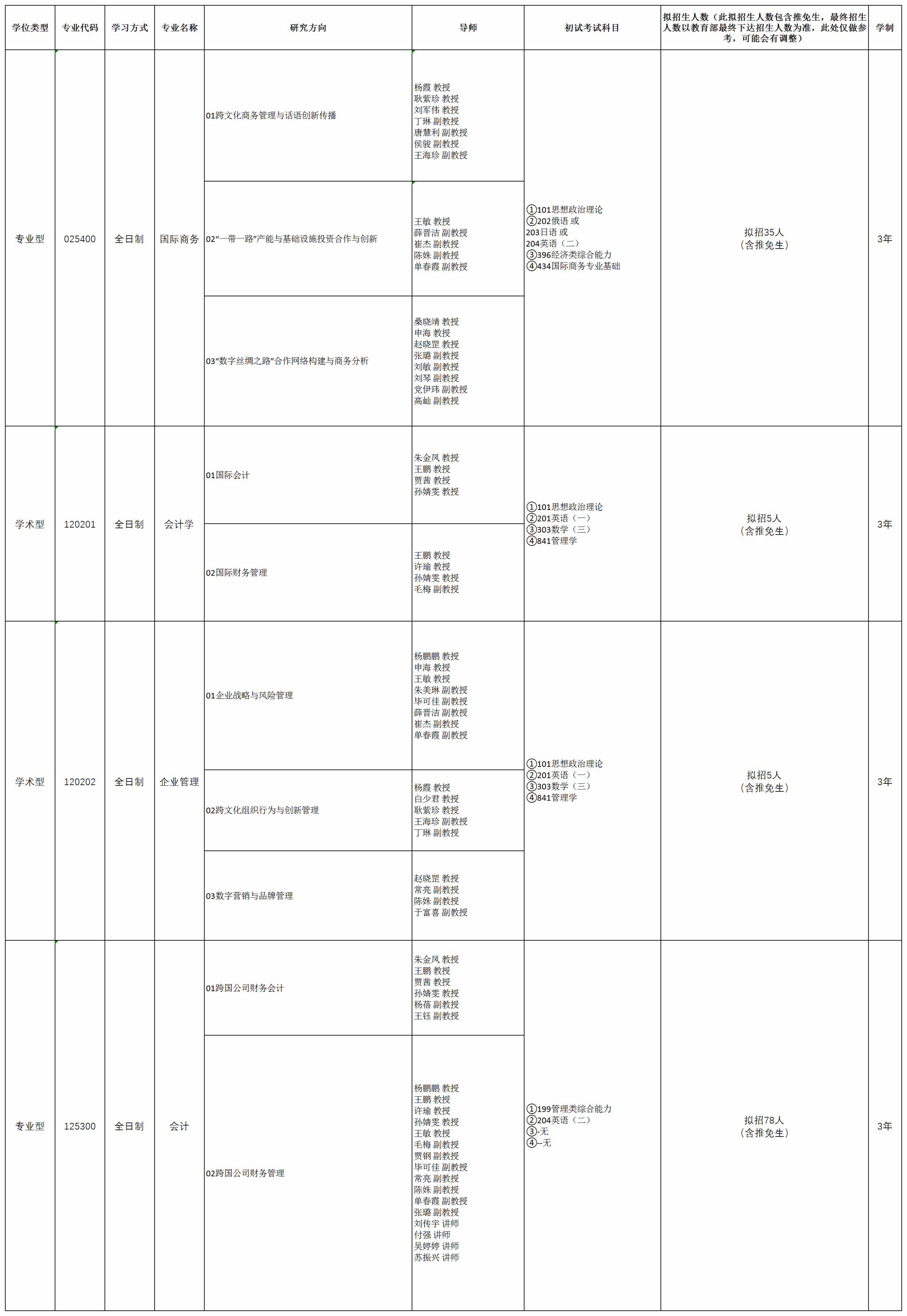 三、国际商务(025400)下设3个研究方向: