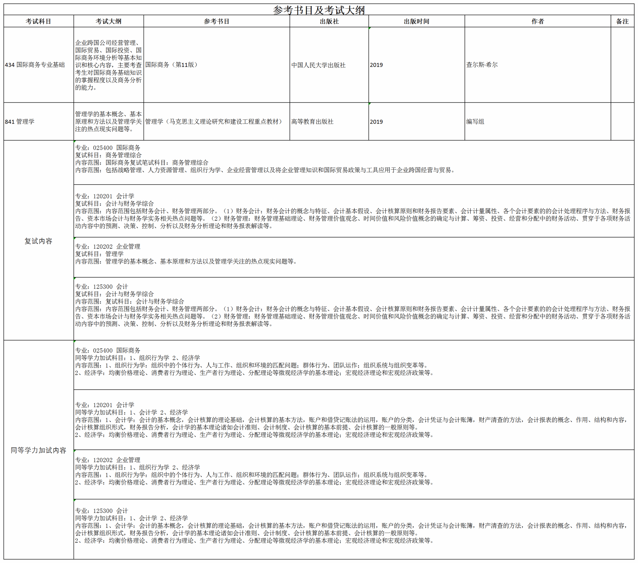 注:会计(125300)全日制与非全日制考试科目相同。